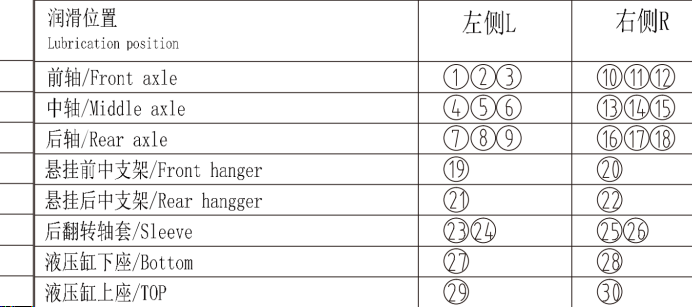 Timely lubrication should be provided for parts such as the axle,suspension,andcylinder support.It is recommended that the axles and cylinder supports be lubri-cated at least once a weekThe suspension system(including leaf springs)should